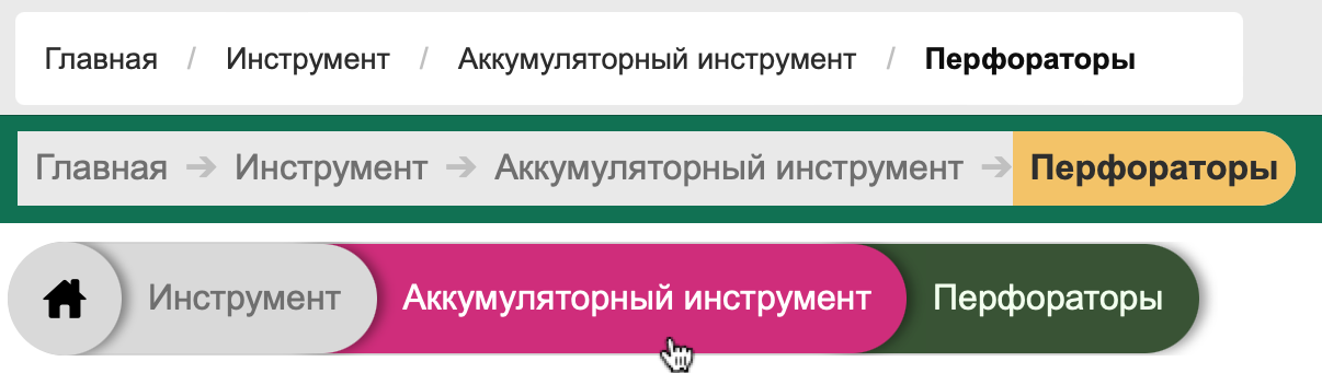 Первой в цепочке ссылок, как правило, идёт главная страница, а последней — текущая веб-страница. Вместо надписи «Главная страница» также применяют изображение домика. На рис. 1 приведено несколько вариантов хлебных крошек.