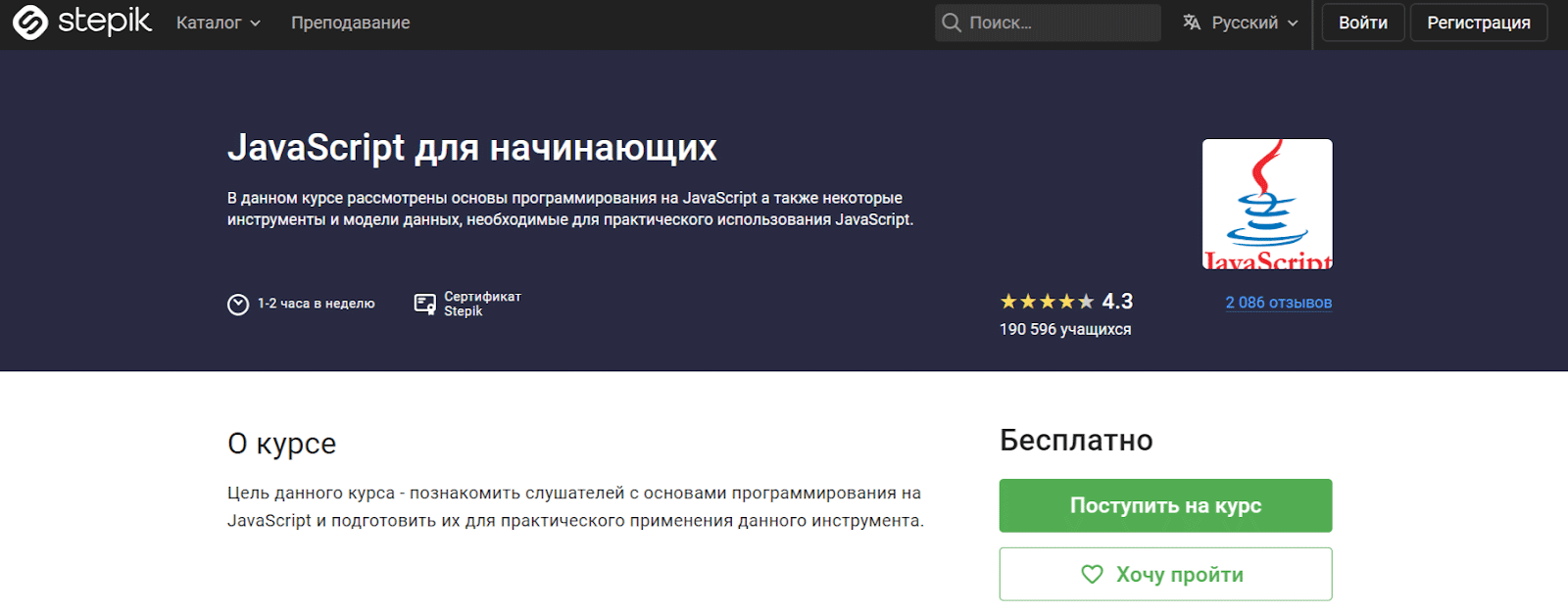 - Чему научитесь: обучение на курсе завершило 190 000+ человек. На нём получите навыки и знания, необходимые для практического применения JavaScript и дальнейшего развития в качестве программиста.