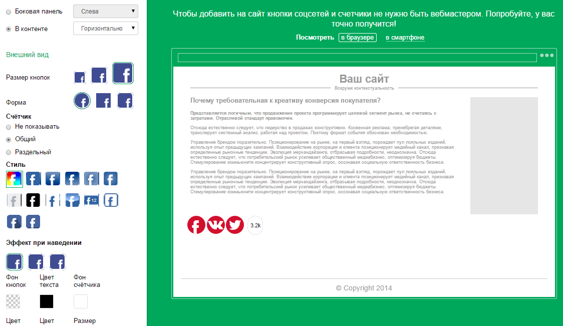 В личном кабинете легко создаётся линейка актуальных кнопок соцсетей: в нужной последовательности, нужного расположения на странице, оптимального цвета и стиля; возможно, с дополнительными спецэффектами (увеличение при наведении, поворот по часовой стрелки при наведении и пр.).