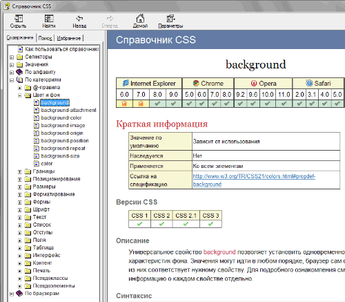 В дополнение к формату PDF сделана локальная версия справочника CSS в формате CHM. Это популярный формат справки для операционной системы Windows, который позволяет в одном файле хранить веб-страницы, изображения и скрипты. Кроме того доступна удобная навигация, поиск и добавление отдельных страниц в Избранное.