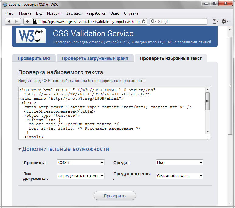 Последняя вкладка предназначена для непосредственного ввода HTML или CSS-кода, при этом проверке будет подвергнут только стиль (рис. 20.3).