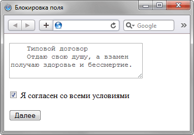 В данном примере применяется блокирование кнопки, но оно снимается, как только пользователь поставит флажок возле текста «Я согласен со всеми условиями».