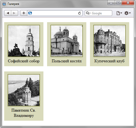 Чтобы создать галерею, представленную на рис. 3.28 для тега <div> следует задать значение display как inline-block, а внутрь него добавить изображение и подпись через тег <p> (пример 3.18).
